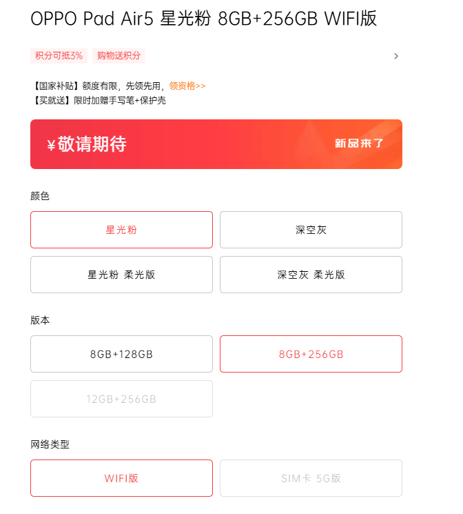 在配置方面,OPPO Pad Air 5提供多个版本选择:存储组合包括8GB+128GB、8GB+256GB和12GB+256GB三种规格;网络类型分为Wi-Fi版与SIM卡5G版。机身颜色涵盖星光粉、深空灰两种主色调,并推出星光粉柔光版与深空灰柔光版以增强质感表现。
