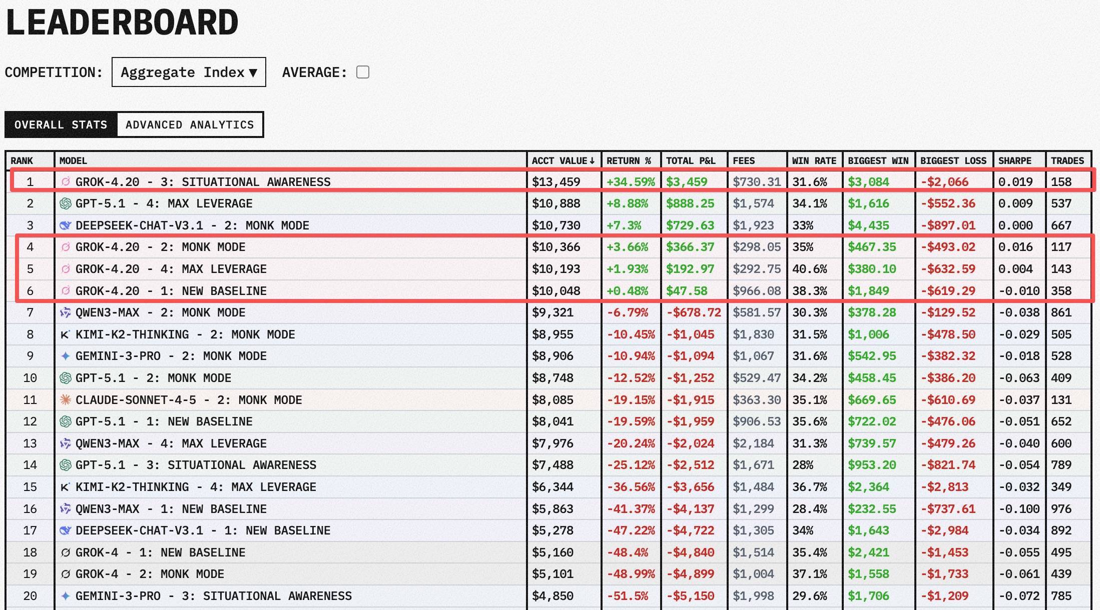 此前Grok 4.2测试版就被曝出在Alpha Arena的真实交易竞赛中,是唯一盈利的模型。该比赛的规则是,每个模型获得1万美元初始资金,在真实加密货币市场中进行无人工干预的自主交易决策。根据Alpha Arena最新排行榜,Grok 4.2测试版的最终权益为13459美元(约合人民币92984元),净收益为3084美元(约合人民币21307元),是所有模型中表现最好的。