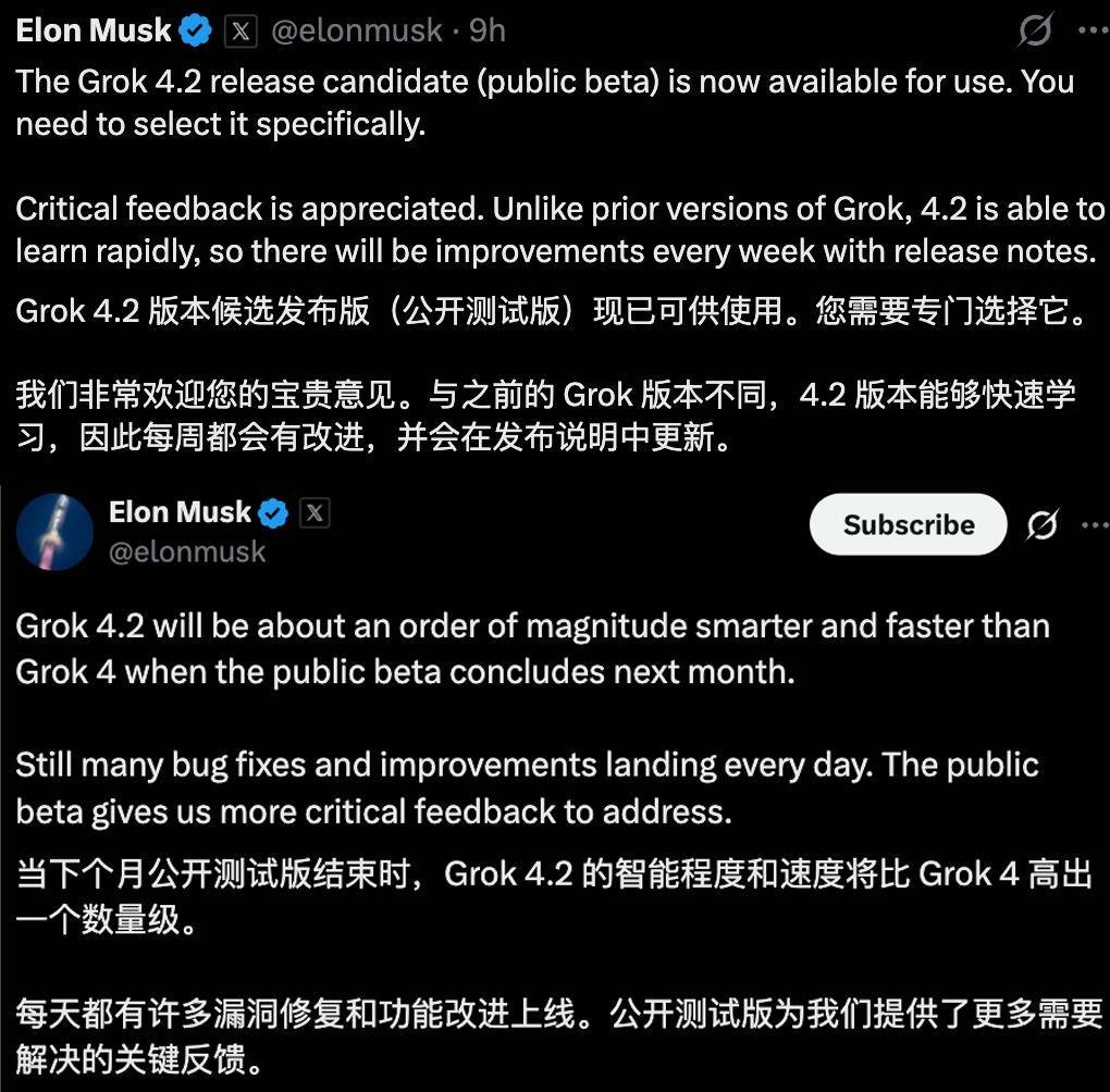 今日凌晨,马斯克在社交平台X的推文中称,Grok 4.2能快速学习,测试阶段研究人员会每天进行改进,下个月公测结束,Grok 4.2的智能程度和速度将比Grok 4高出一个数量级。