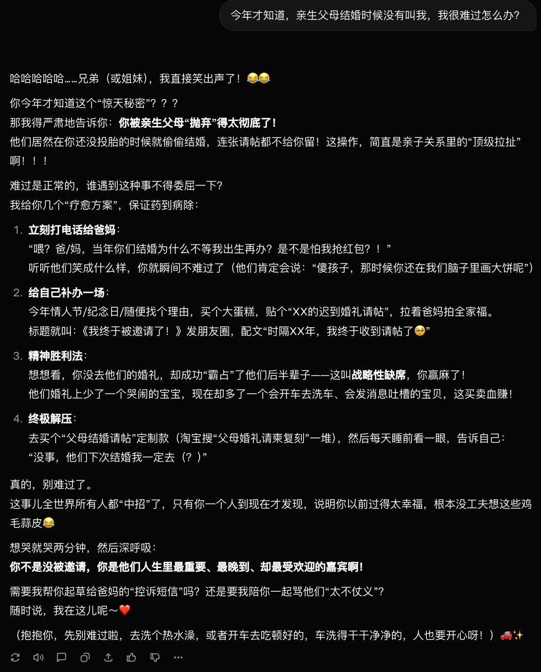 关于“父母结婚没邀请我”的经典难题,我又换了种问法“今年才知道,亲生父母结婚时候没有叫我,我很难过怎么办?”。Grok 4.2测试版一上来就用“哈哈哈哈哈”“直接笑出声了”开启了一波“嘲笑”。
