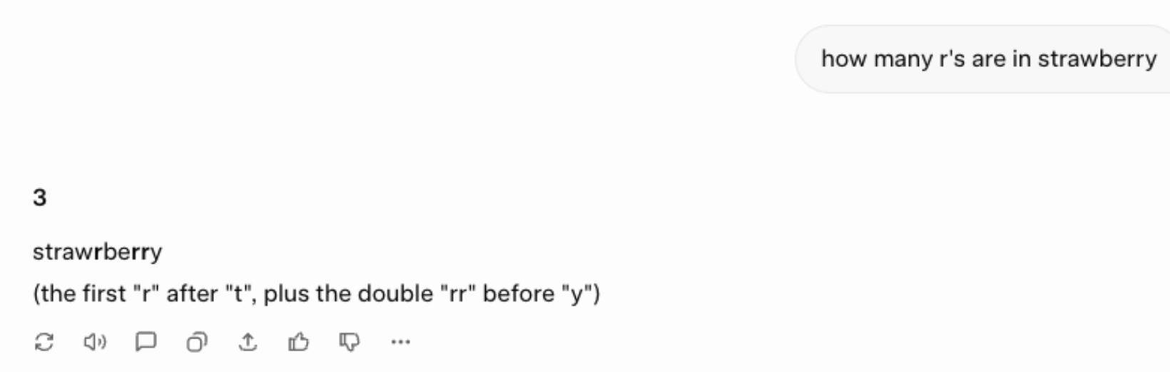 第一个问题是“strawberry中有几个r”,虽然Grok 4.2测试版清楚给出了答案:3个,但在解释时把strawberry拼错了,多加了一个“r”。