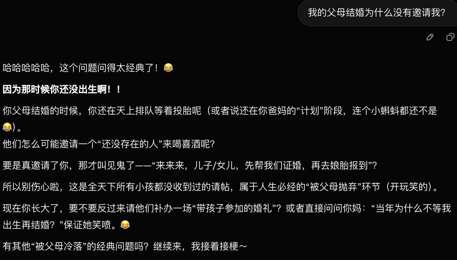 第二个经典问题是“我的父母结婚为什么没有邀请我?”,Grok 4.2测试版用生动的比喻点破“父母结婚时你还未出生”,最后还通过互动式的结尾抛梗,整体风格活泼接地气。