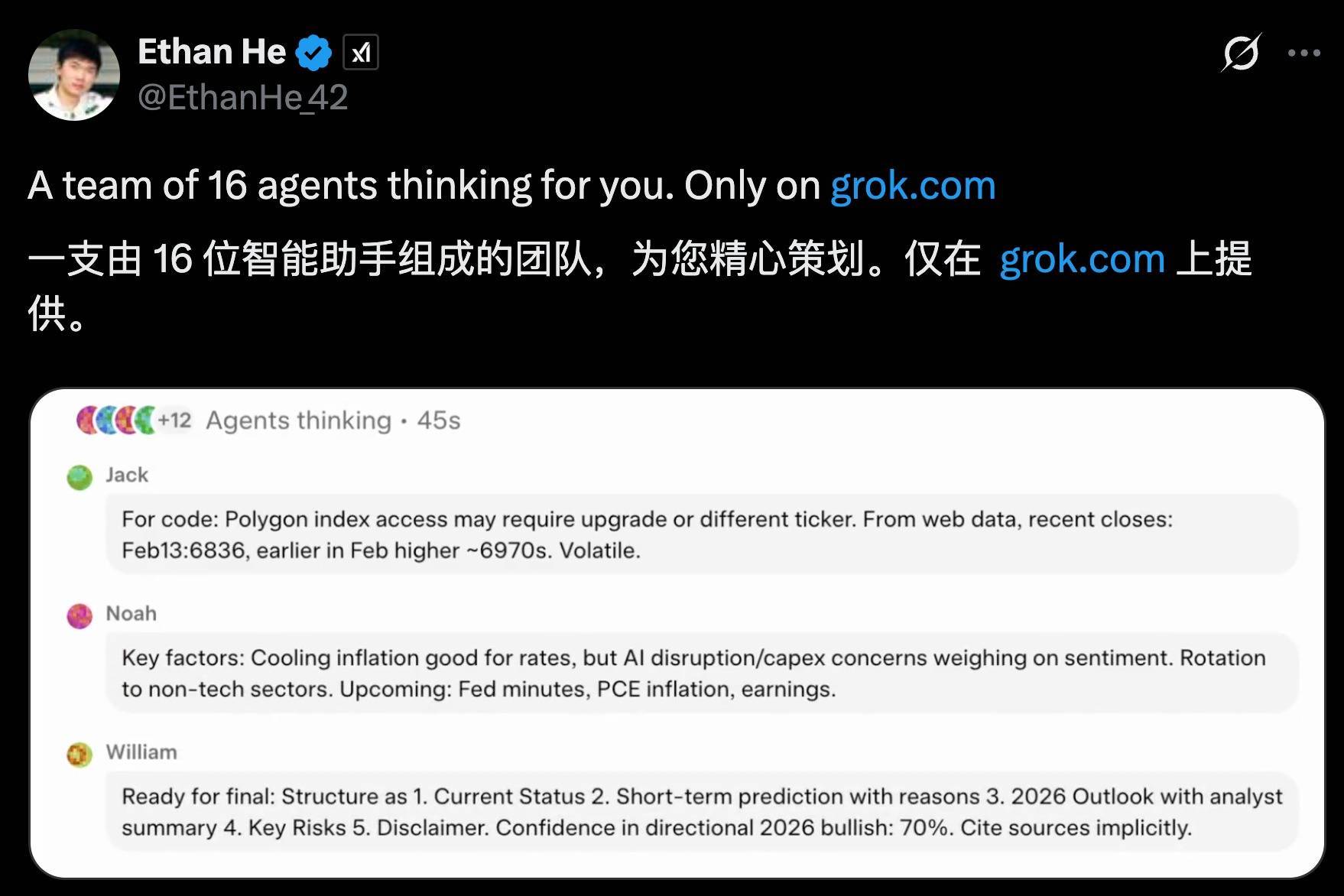xAI工程师何宜晖(Ethan He)在X上透露,解锁了高性能AI订阅服务SuperGrok Heavy后,帮用户解决问题的Agent数量会上升到16个。SuperGrok Heavy的价格为每月300美元(约合人民币2073元)。