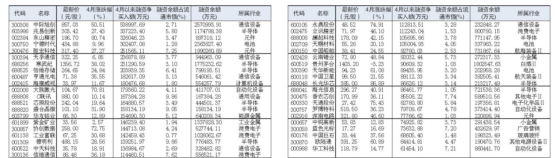 根据Wind数据统计,截至4月27日,4月以来已有1946股获杠杆资金净买入,其中,41股融资净买入额超过6亿元。从二级市场来看,长光华芯、东山精密、天通股份、永鼎股份等股股价4月以来涨幅居前。