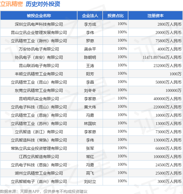 本站消息,根据天眼查APP显示,立讯精密(002475.SZ)新增一起对外投资事件,被投资公司为立讯能源(江西)有限公司维嘉优配,法定代表人邓小兰,投资占比为50%。该公司从事计算机、通信和其他电子设备制造业,注册资本为10000万人民币。目前,立讯精密共存在对外投资49项,投资占比前20的项目见下表: